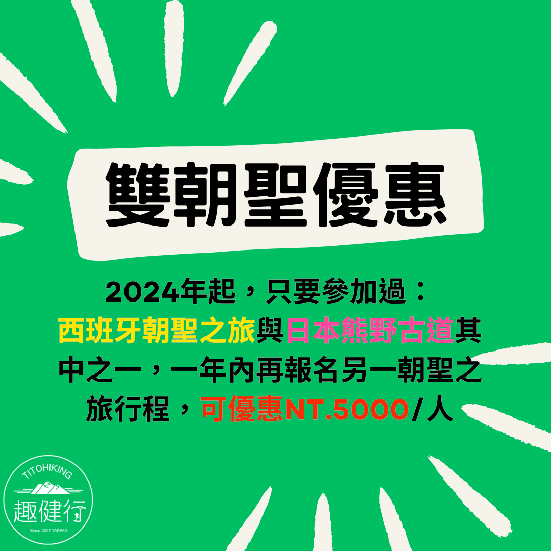 2024年起參加過趣健行西班牙朝聖之路、日本熊野古道,其中一條巡禮,一年內再報名此系列行程, 享優惠NT.5000/人