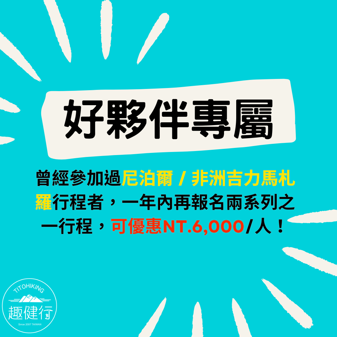 曾參加過趣健行尼泊爾 / 非洲吉力馬札羅山行程者, 續報兩系列行程之一, 享優惠NT.6000/人