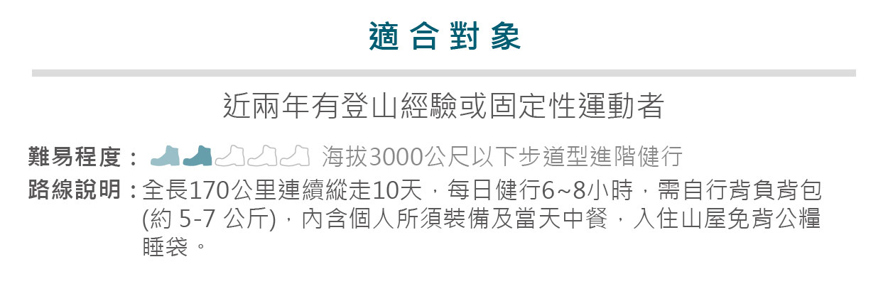 十多年來,趣健行以資深海外登山專家的嚴謹精神,成功守護 5,000 人次平安下山,累積了50 條以上原創海外登山健行路線。「無論如何。還是在山上最開心,」爬了幾十年高山的 Tina 與夥伴們除了持續為山友們守護冒險之路的安全與夢想,也自 2018 年起,以三年攀登計畫邀請想要一起自我超越、攀登世界高峰的同好加入。「日本健行路線」是多年來 Tina 親自開發多條海外登山健行經典路線,日本在登山項目上非常重視自然保育與山屋規劃完善,相較其它國家價錢也較平易近人,非常適合海外登山的入門者。邀請你和我們一起走到海角天涯、看盡世界美景、品味自然風光!